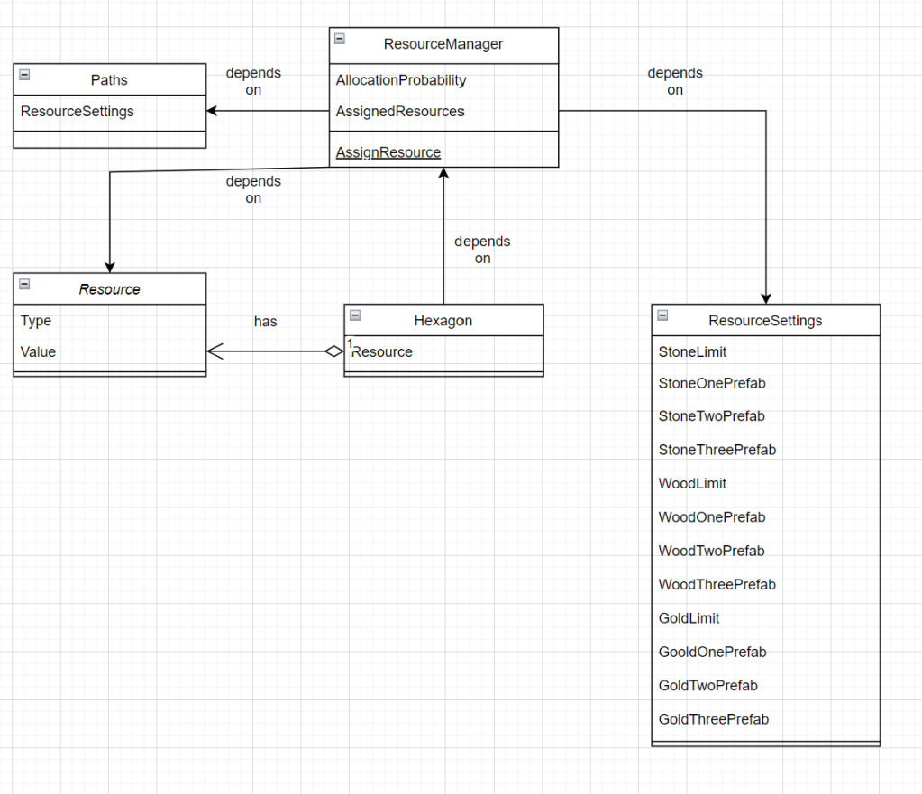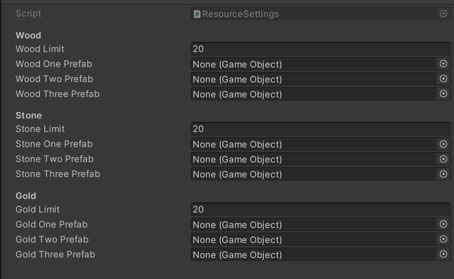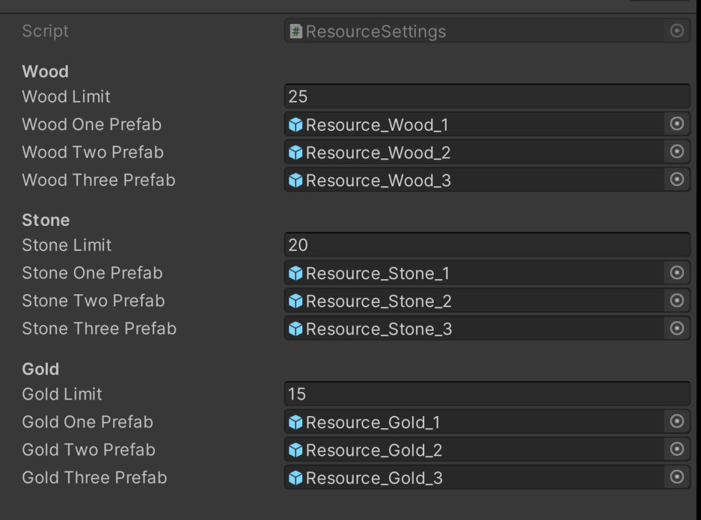 - ResourceSettings.cs – a class that contains all of the 9 prefabs as well as a limit of each respurce.