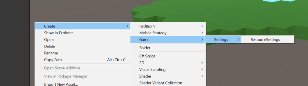 So let’s create the ResourceSettings by clicking on the menu displayed above in the Assets/Resources/Settings folder (you have to create the Resources and Resources/Settings folders yourself).