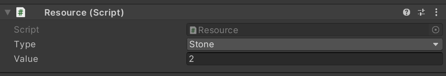 First let’s start wit a Resource class. A resource contains a type and the amount of resource it represents. Note that both m_Type and m_Resource are private since we don’t want the values to be modified from outside of the class. We only want resource to be modifiable in the inspector. That’s why we add [SerializeField] attribute.