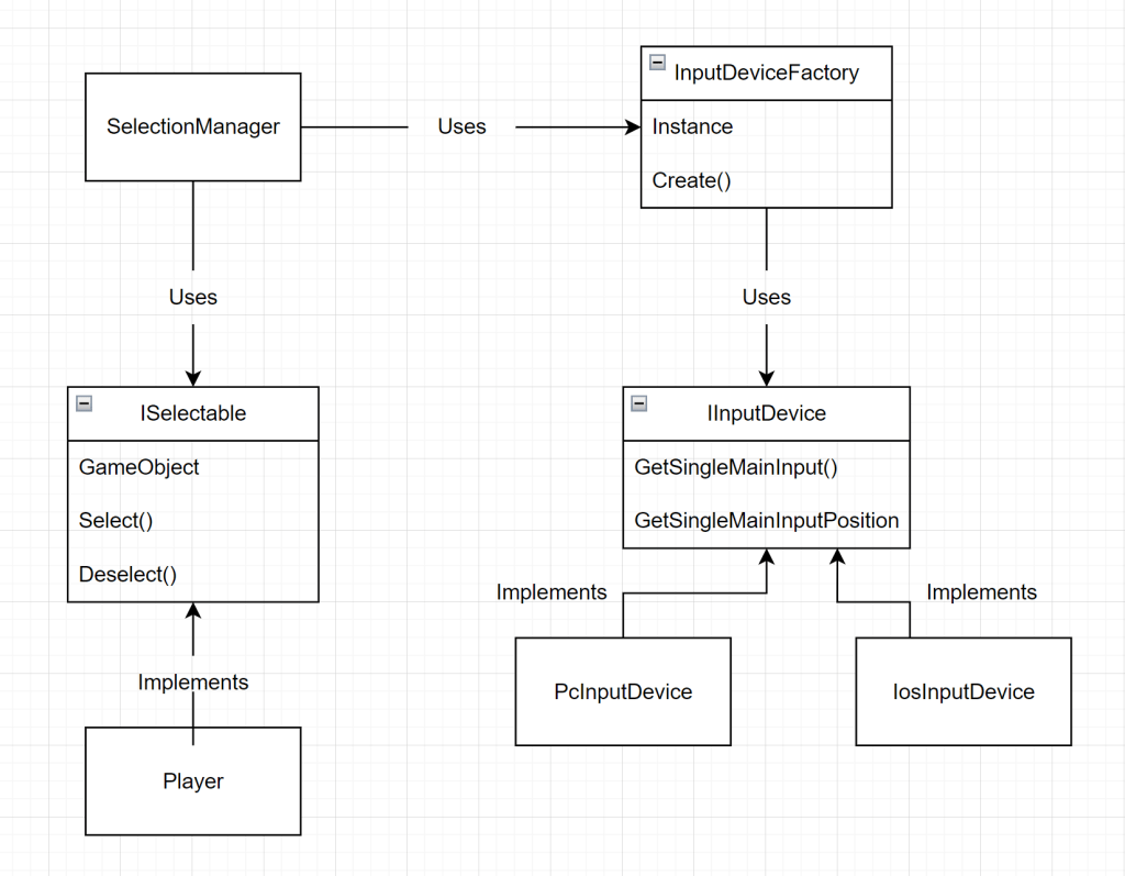IInputDevice – an interface that represents an input device. An input device in this case is limited to a pc or an ios device. An input in this case is limited to a single click or a single touch (referred to as a Single Main Input)